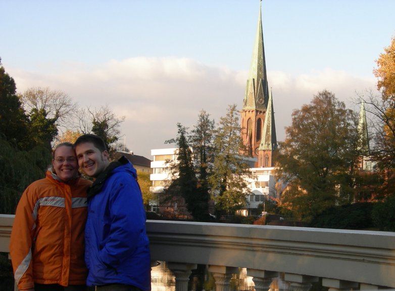 The most recognizable building in Oldenburg is the Lambertikirche (Lamberti church), but the church was closed for renovations, so Carrie and I walked across to the Schlossgarten (Castle garden – now more of a city park), and took a picture of us with the Lambertikirche tower in the background.